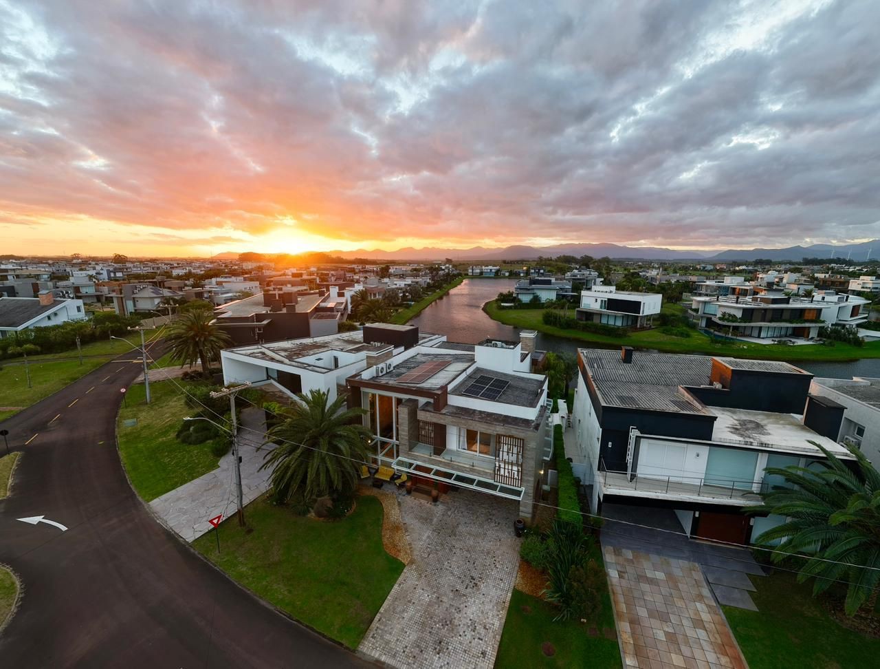 CONDOMÍNIO ENSEADA ——————————————— - Frente Avenida - Melhor orientação solar - Frente Leste, fundos Oeste - Beira lago - Sobrado com 346 m² - 04 Suítes sendo 1 master - Lavabo - Elevador - Deposito - Mobiliada e Decorada - Pé direito Duplo - Piscina Aquecida