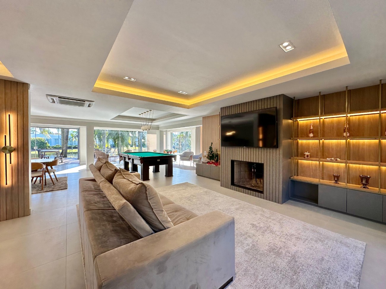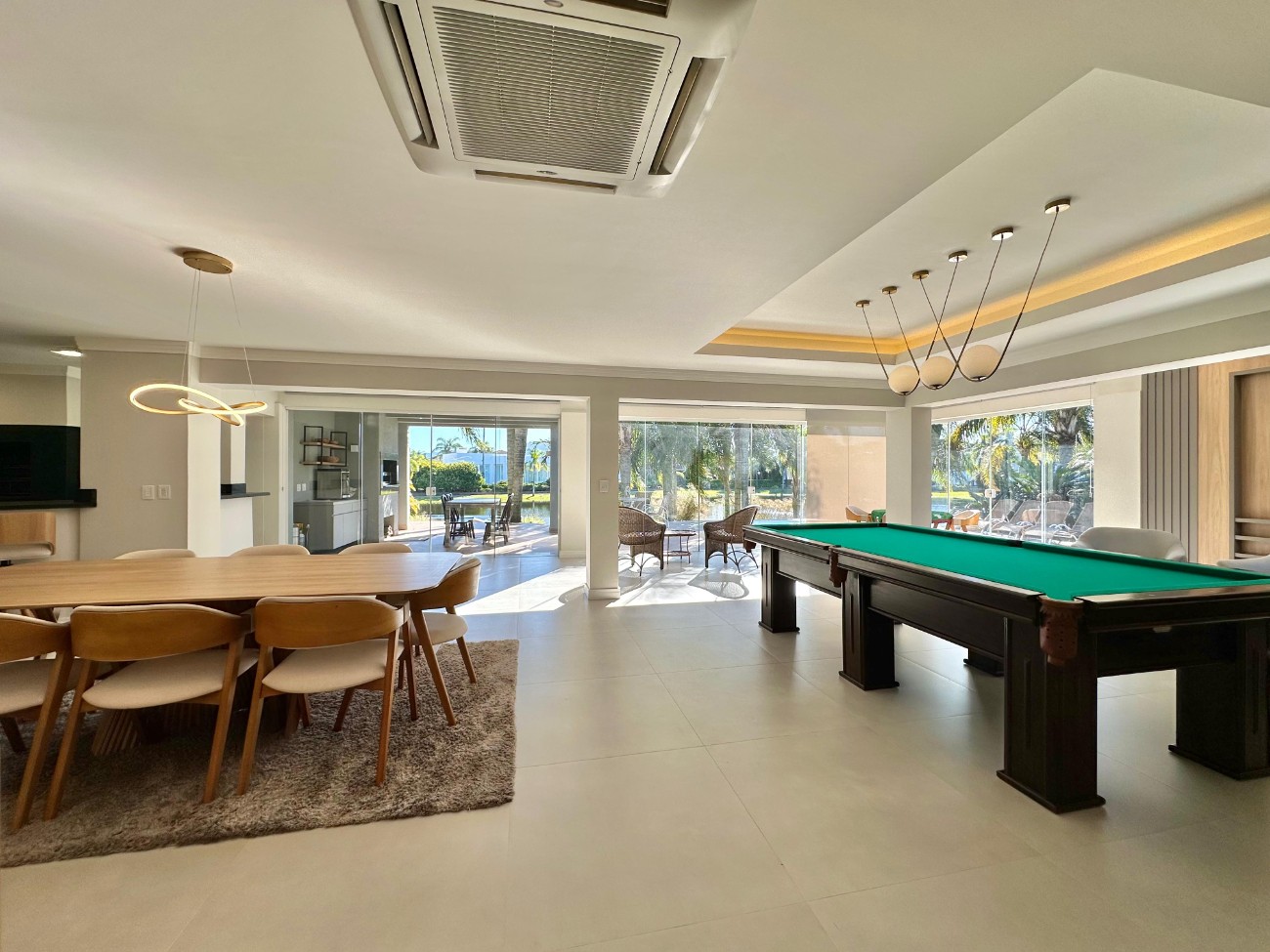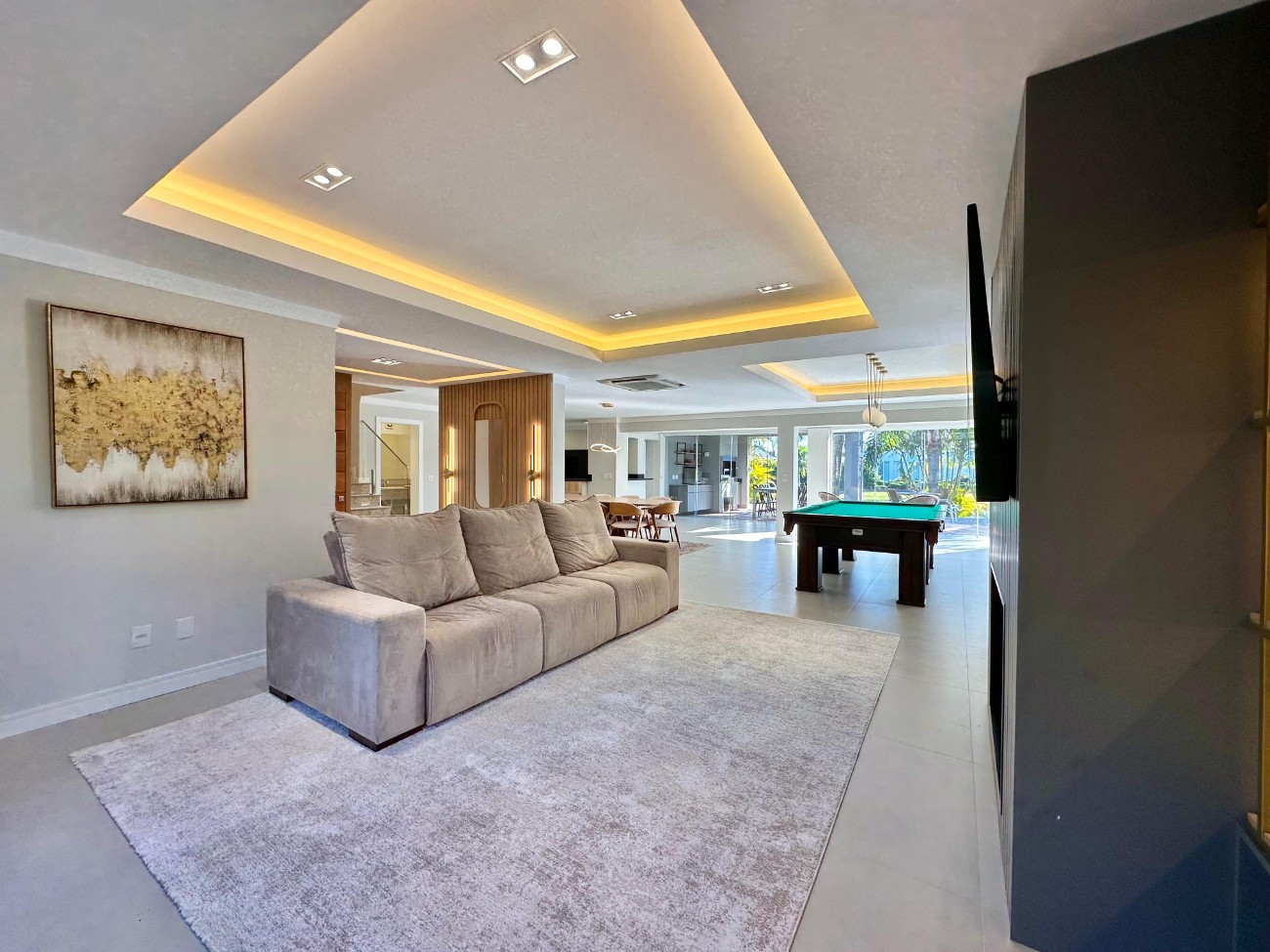 05 suítes (1 master com hidromassagem) 430 M² de área construída 624 M² totais de terreno Lavabo Mobiliada e decorada Gourmet com bancada americana Área de serviço Dependência de empregada Piscina com hidromassagem e aquecimento Elétrico 2 trapiches privativos Área gourmet externa Sistema de som interno e externo Alameda área verde Fundos com 26 metros de Lago Localização ímpar dentro da ilha Paisagismo e iluminação