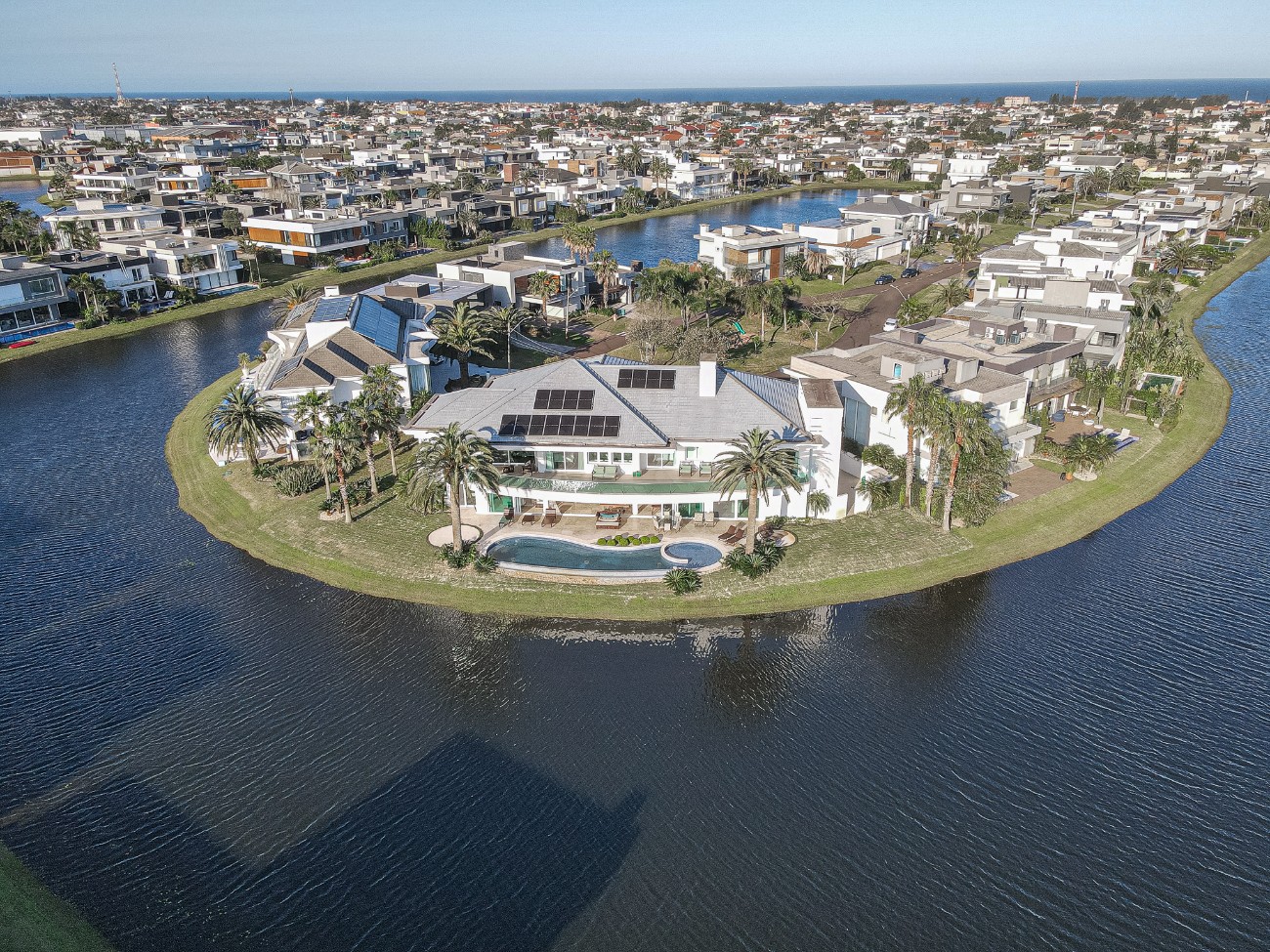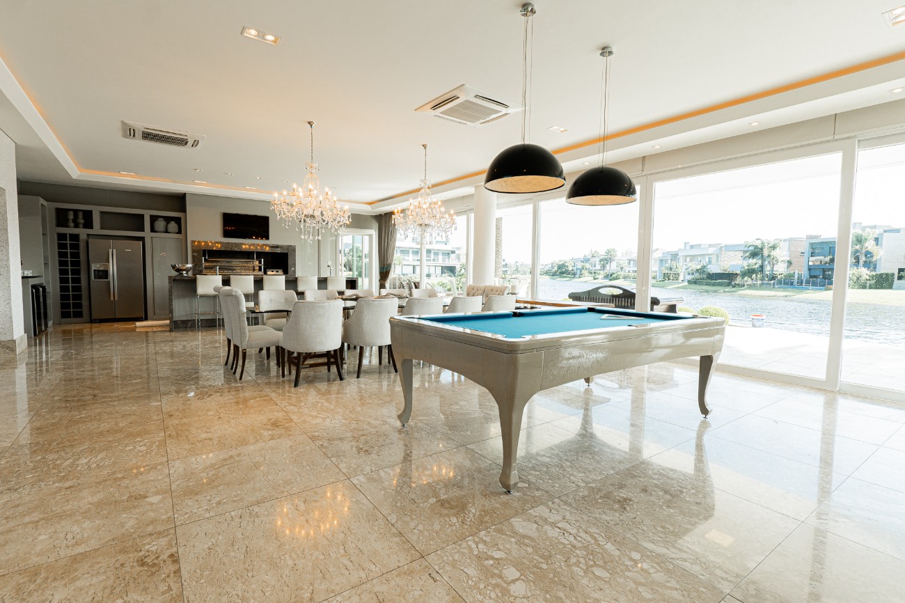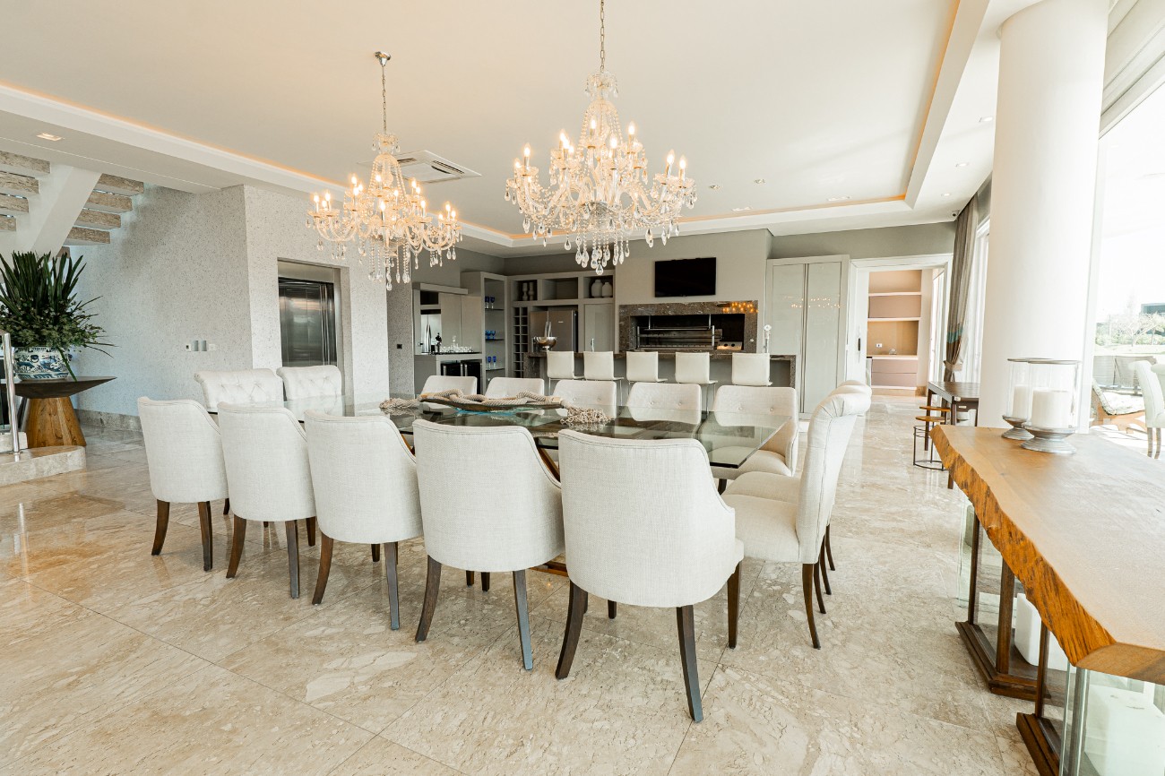 Magnifico sobrado beira lago composto por 2 lotes em um dos melhores condomínios do litoral Padrão e acabamento classe AAA Frente leste Mobiliado e decorado Living em 4 ambientes pé direito duplo 8 suítes sendo 1 térrea e 6 com banheira Dependência de empregada completa Piscina em concreto com borda infinita Vista panorâmica para o lago Área gourmet Elevador Adega climatizada Sistema de automação Vaga para 3 carros