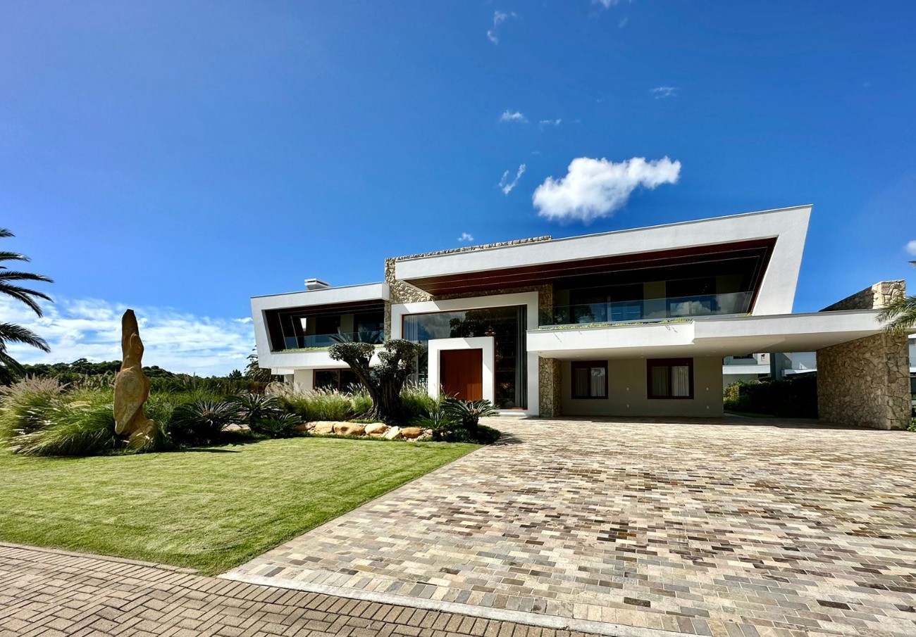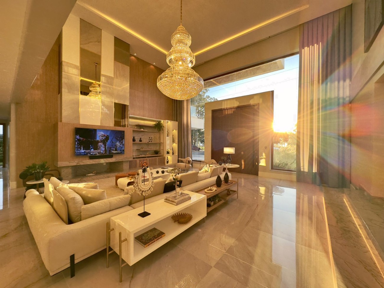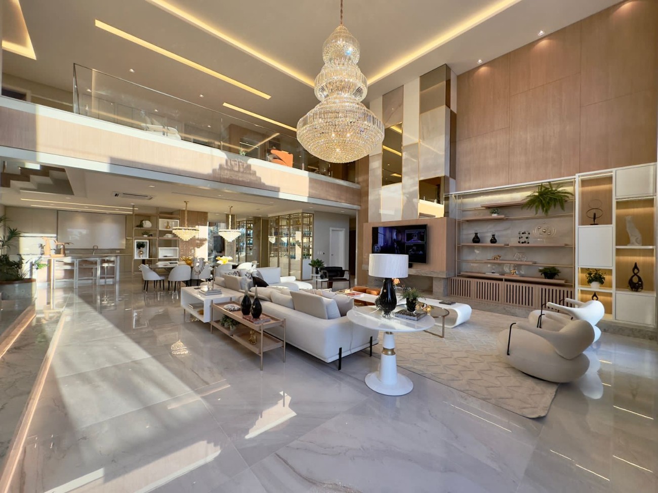 ?Sobrado com 907, 5 M²?02 Lotes?06 Suítes (sendo uma master com Hidro e closet)?Lavabo?Pé direito Duplo?Mobiliado?Finamente decorado?Cinema?Academia?Espaço Kids?Esquadrias em PVC?Persianas automatizadas?Home office?Automatizada?Elevador?Adega?Dependência de empregada?Piscina de concreto com hidro?FirePlace?Espera pra sistema fotovoltaico?Garagem para 3 Carros ———————————————?Condominio?Infraestrutura completa?Infraestrutura Náutica com acesso à lagoa?02 Marinas