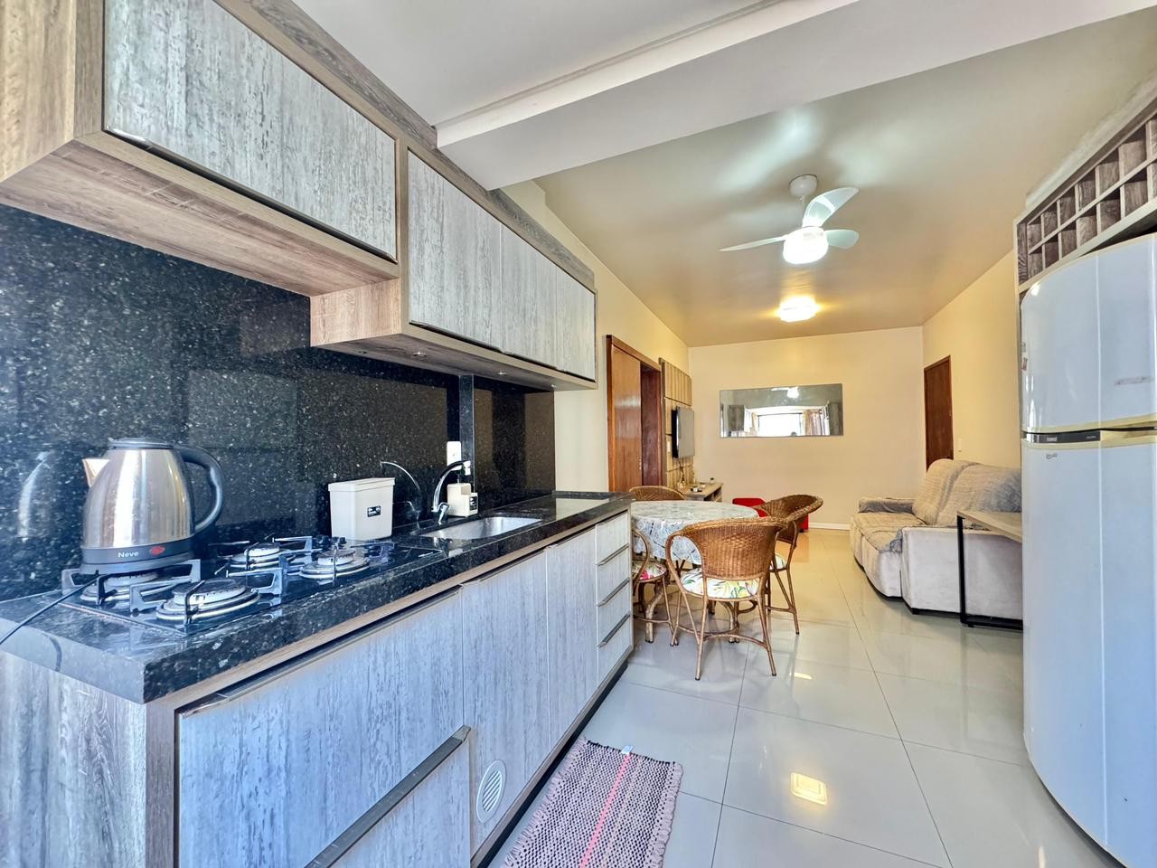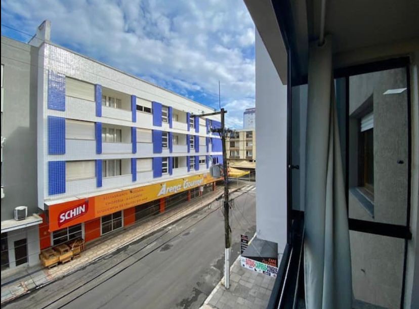 Apartamento de frente 2 dormitórios 1 banheiro Mobiliado Terraço coberto privativo Living integrado (sala, cozinha + sacada com churrasqueira) 74m² Frente Leste ————————————————- Edifício Elevador No centro da cidade 2 quadras do mar Ao lado do shopping e restaurantes
