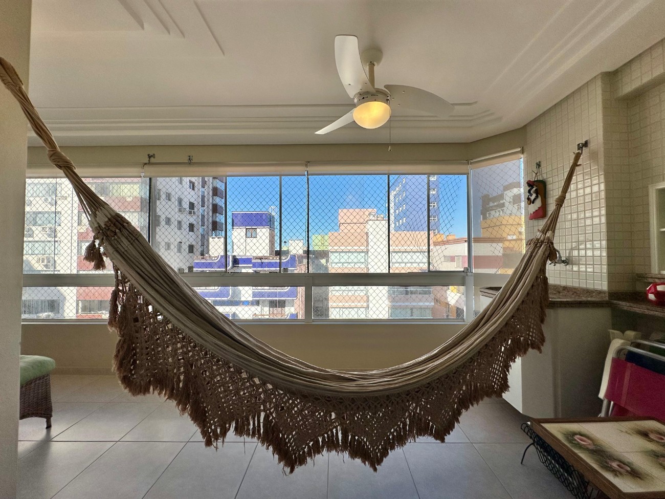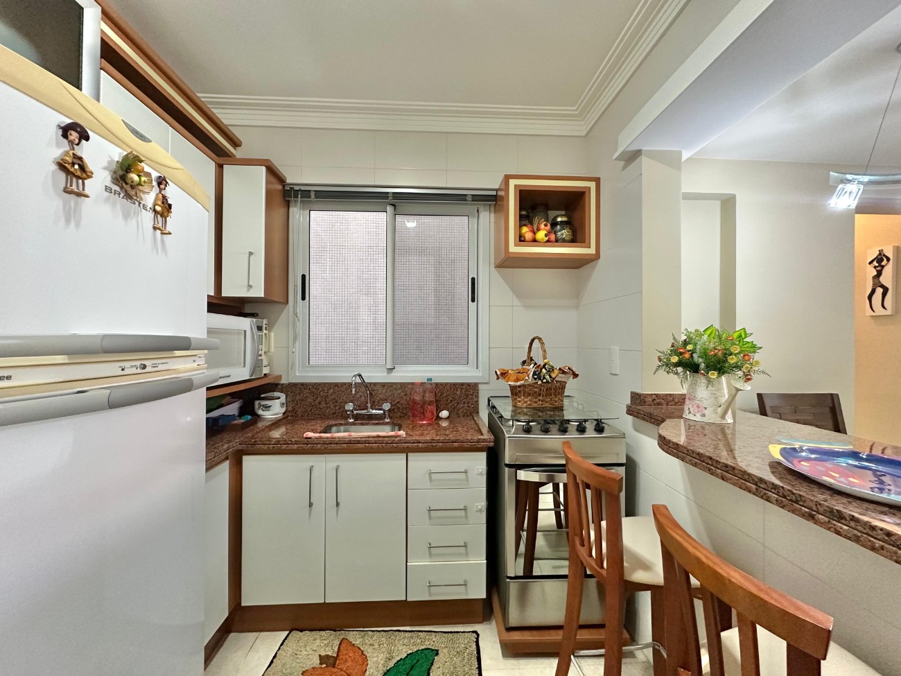02 dormitórios, sendo 1 suíte Cozinha equipada Área de serviço Living 02 ambientes Banho Social Sacada com churrasqueira Água quente Gás central 114, 77M² Total Box para carro ——————————————— Edifício: 2 Elevadores Hall Decorado