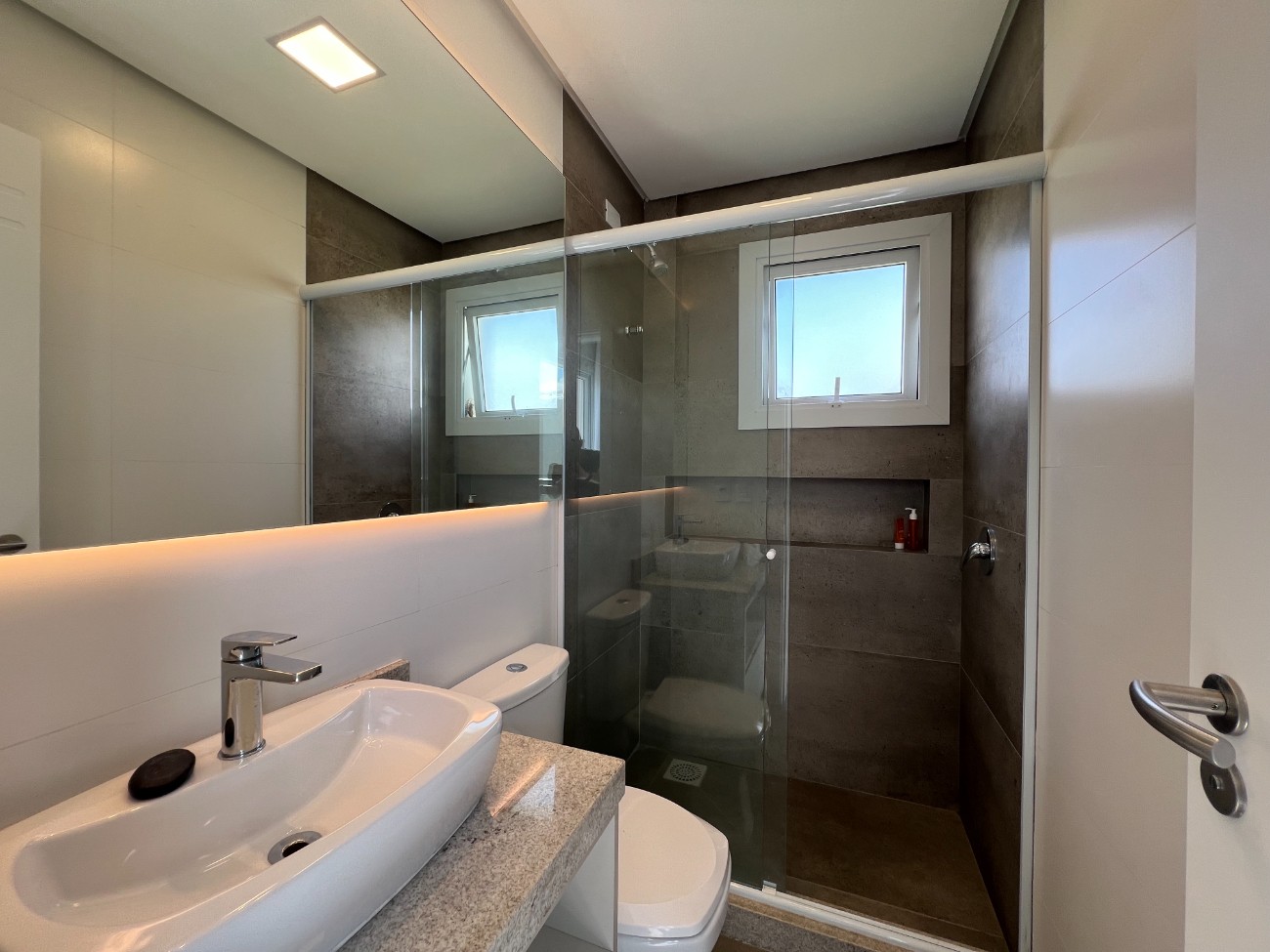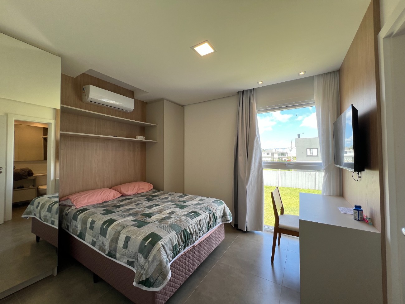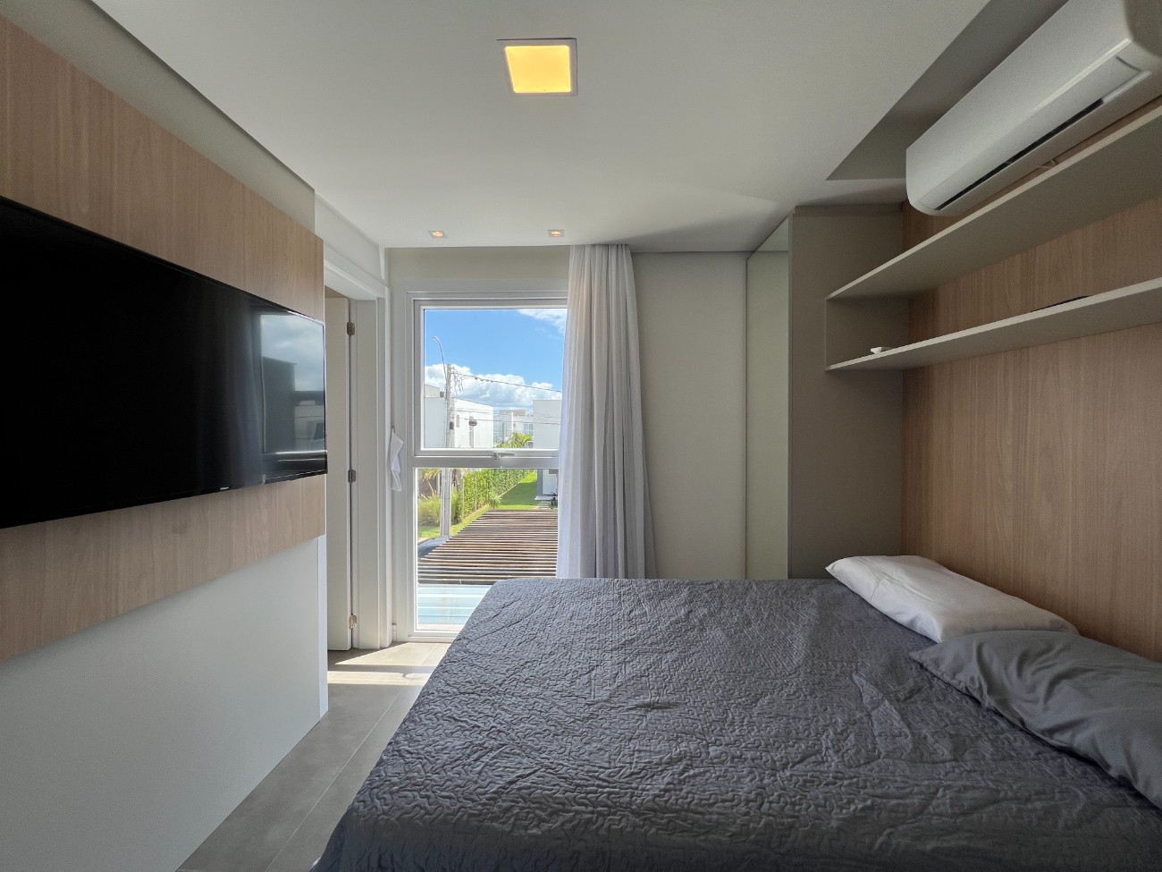 Casa no condomínio One em Atlântida, com 3 suítes, living 2 ambientes, cozinha, churrasqueira, lavabo, área de serviço, mobiliada, 154m² privativos, orientação solar frente norte, na piscina frente sul.